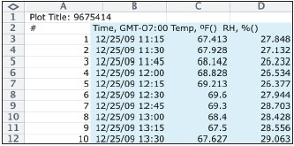 Excel提供的数据显示显着的控制。创建一个图的第一步是打开的。csv数据文件,并选择时间戳记加上利息观察数列不需要列。在下面的例子中,已选定的时间,温度和相对湿度。