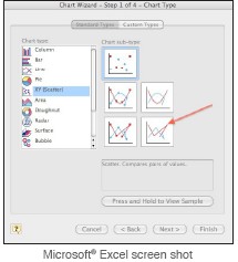 然后选择“插入>图表或单击”图表向导“。选择类型为“XY(散点图),”分型线。这将使图可以缩放和格式更容易比与“线”的图形选项图形。