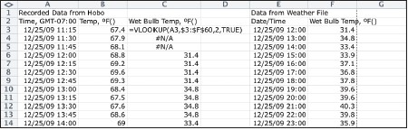 扩大每小时使每15分钟观察,有一个相应的气象观测数据,最简单的方法是使用VLOOKUP函数。这是一个时间戳相匹配的一列与另一列中的时间戳,并带回相关信息的数据库功能。该函数的形式为VLOOKUP(查找值,查找阵列,列类型)。在下面的例子中,使用VLOOKUP函数每小时的天气数据,以配合15分钟的温度观测。
