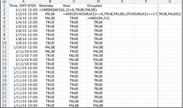例如,要区分自用和空置期间的观察,添加列,确定是否在本周的天是周末或周日和建筑物是否被占用小时的基础上。在下面的例子,建筑占用周一从8点到下午5点至周五。 “平日”列测试来看看,如果这一天是星期一至星期五,“一小时”一栏测试看看小时,上午八时和5时,“占领”一栏相结合的逻辑的结果,以确定如果发生相应的观察,星期一至星期五上午8点和5点之间。