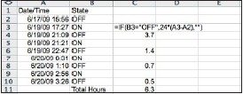 由于我们通常是在“上”的时间,计算前“的状态和当前的”关闭“状态之间的时间间隔。在下面的例子,在C列测试细胞的状态是否是“上”或“关闭”。如果目前的状态是关闭的,时间间隔仅仅是“关”的时间减去“上”的时间。乘以24小时,然后再总额回报的结果差异。在最后一个栏位的双引号告诉IF语句返回一个空值,值相加时,它们将被忽略。